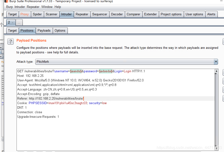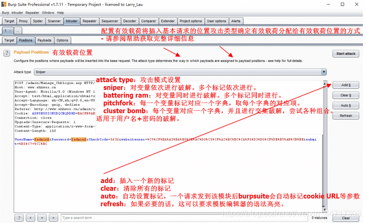 2:Positions 设置Payloads的插入点以及攻击类型(攻击模式)。