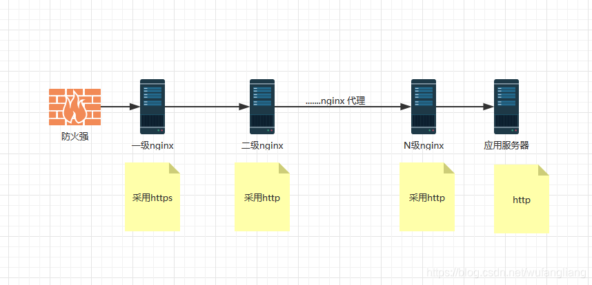一级代理配置https,二级以及以上的nginx 则是配置http。架构图如下: