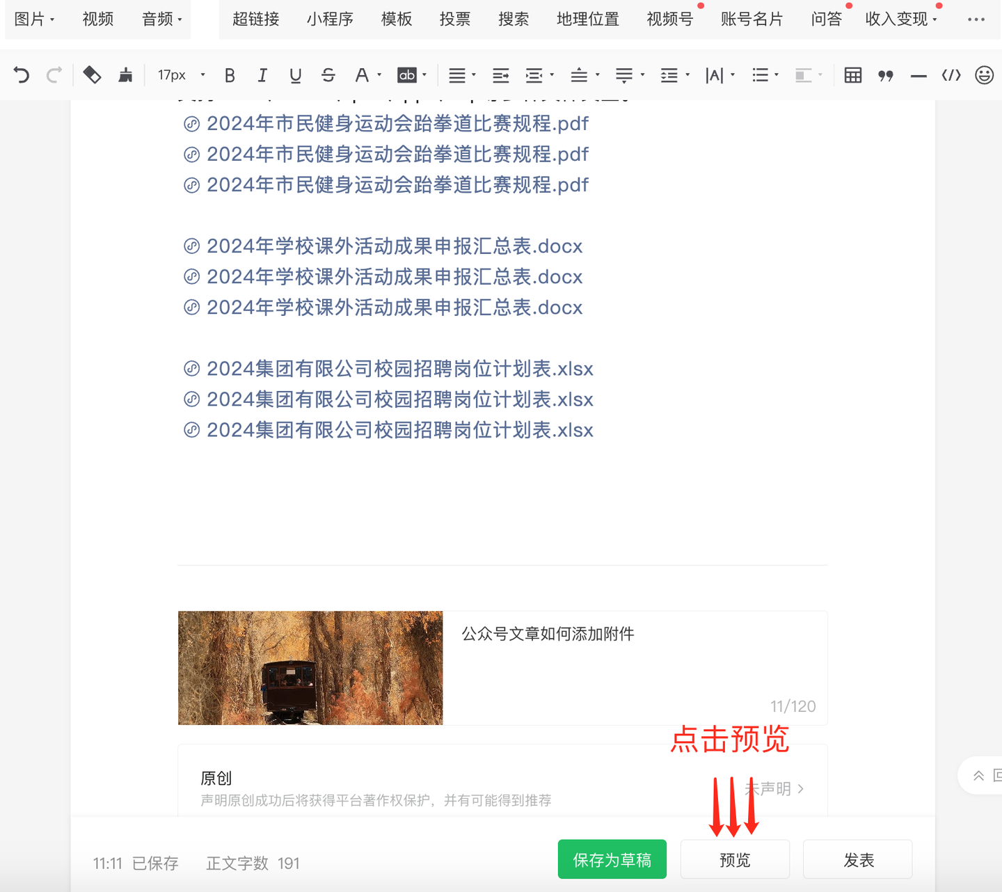 在正式发布之前,最好预览一下,确保文章排版正确,附件可以正常下载。