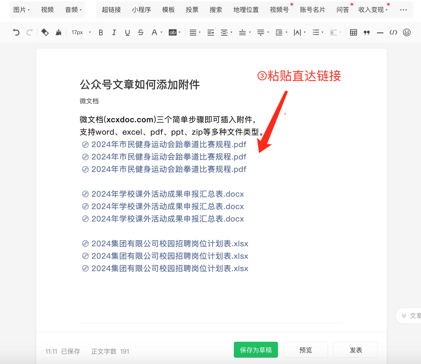 粘贴后可以看到一行蓝色的文字,前面带有小程序图标,这个就是附件下载的链接。
