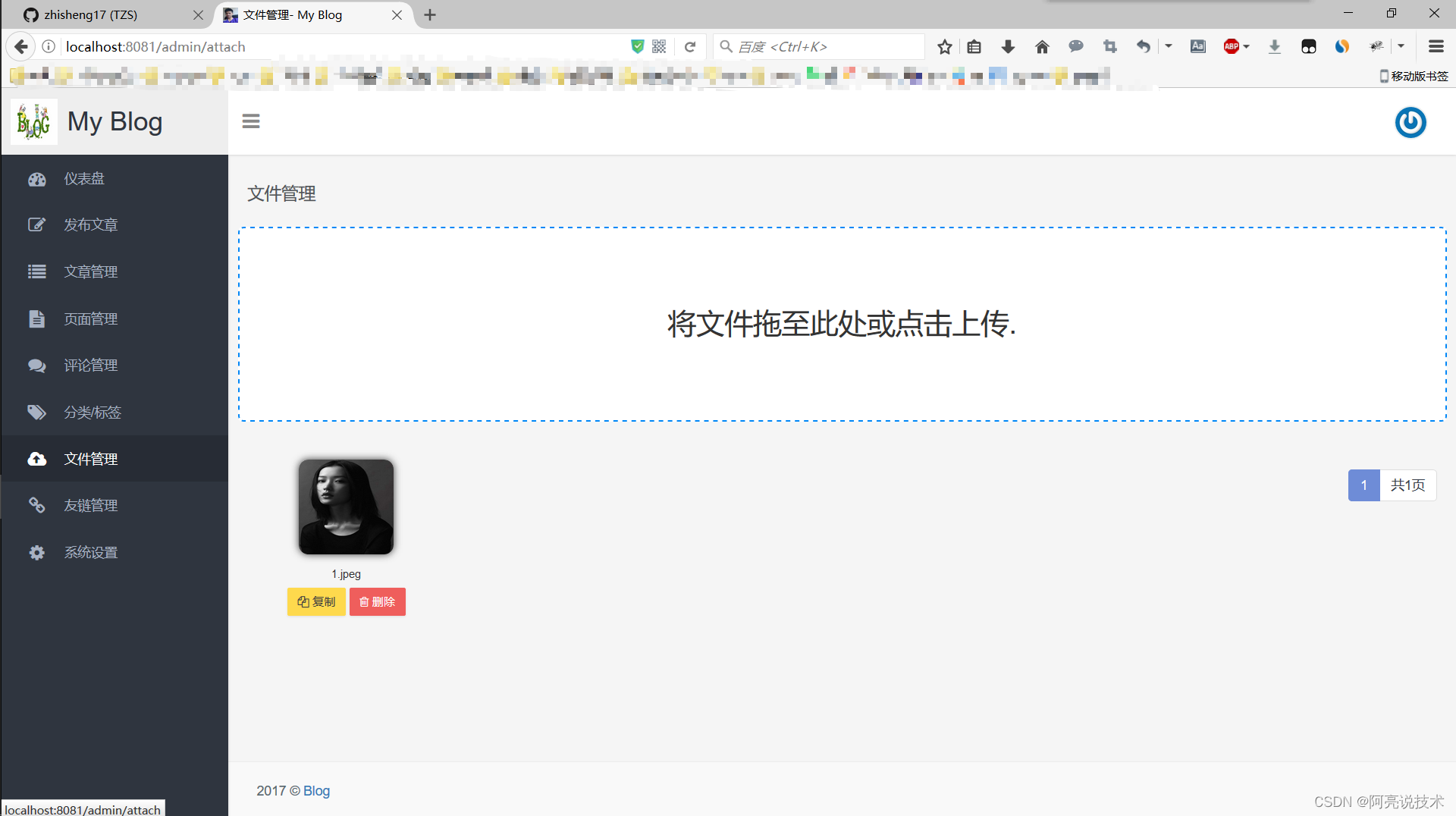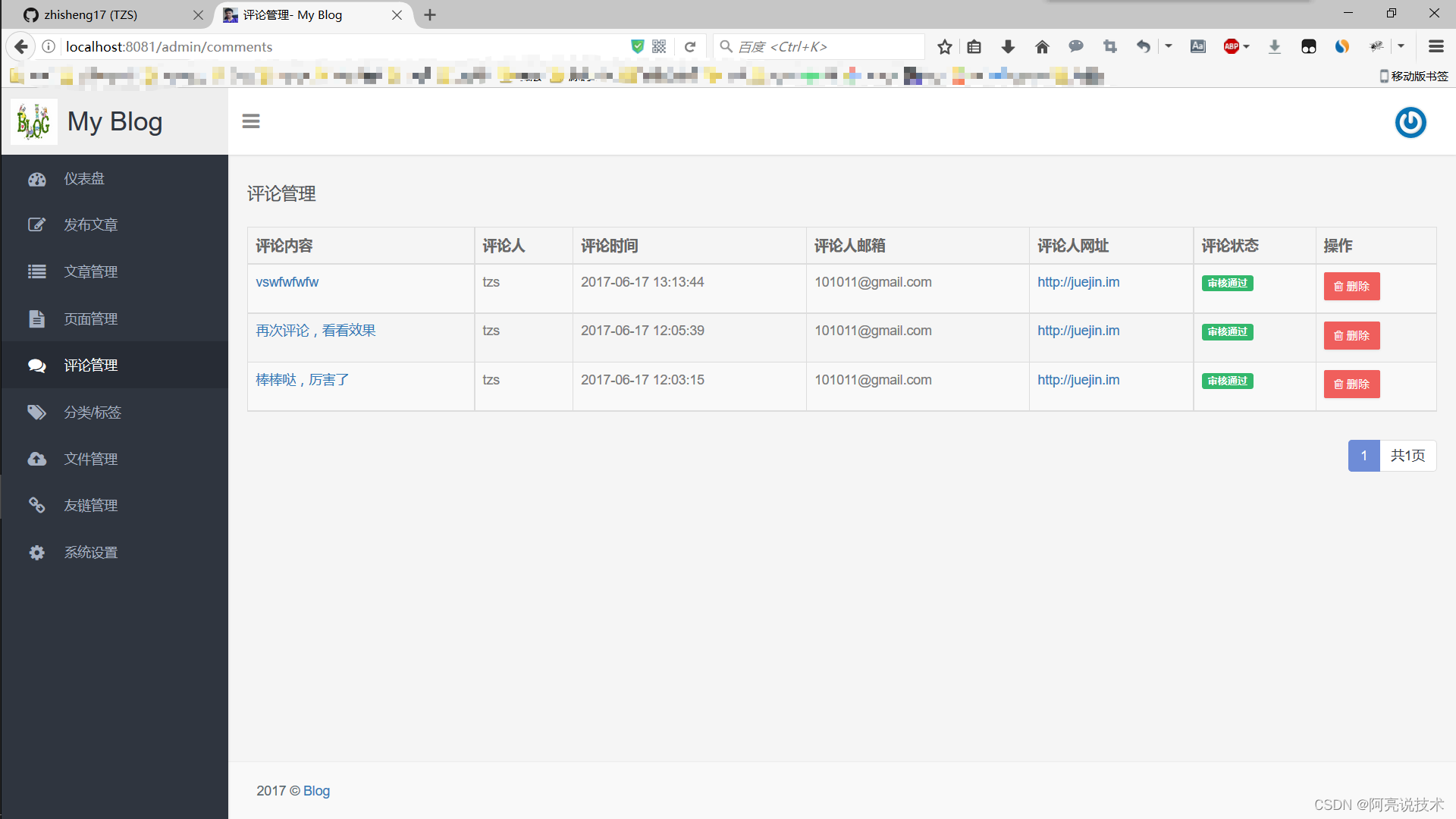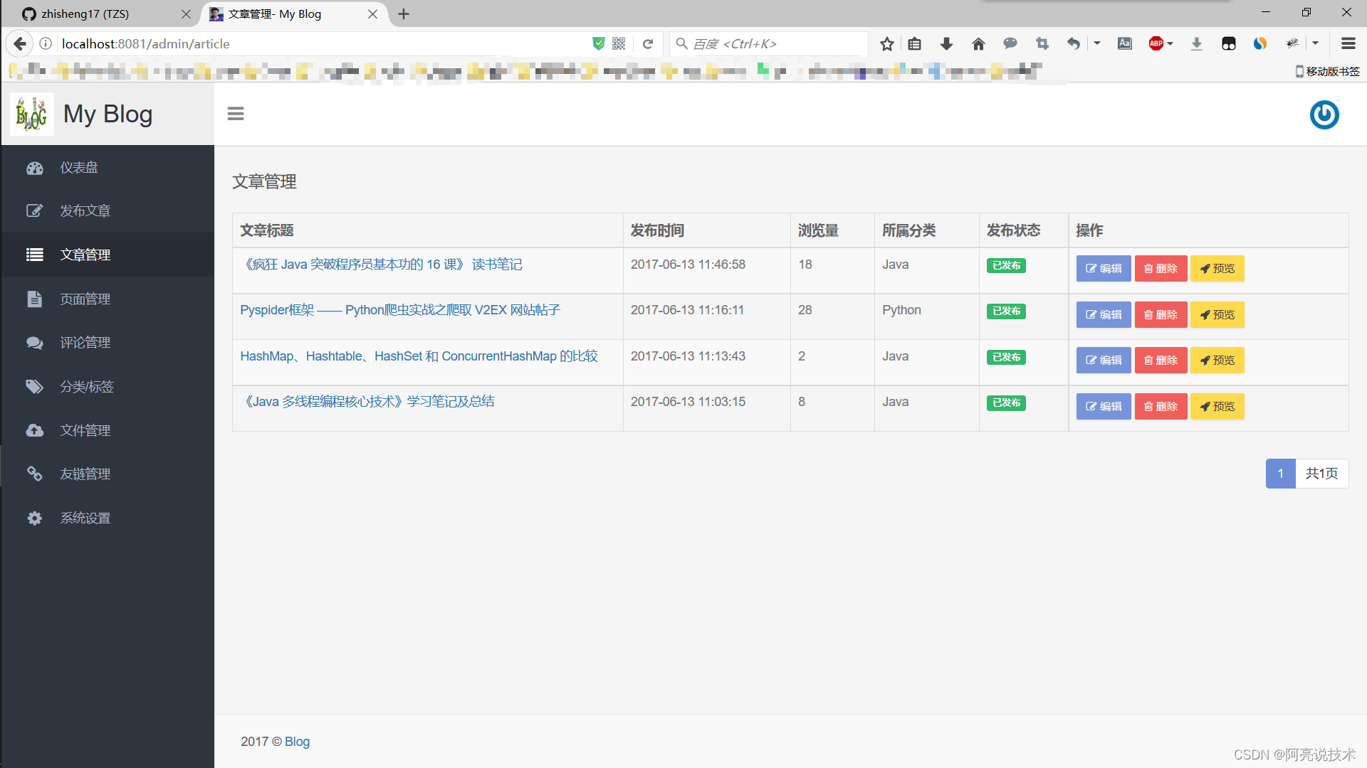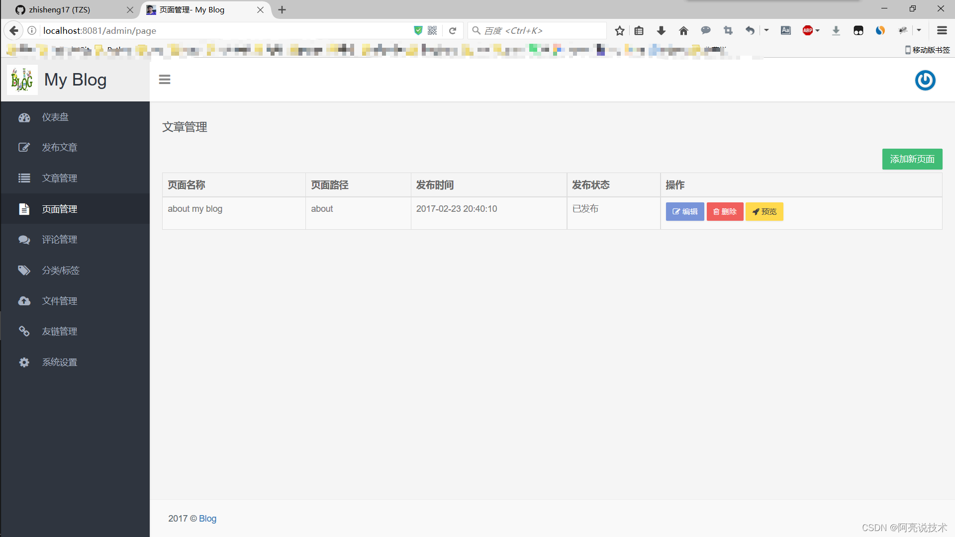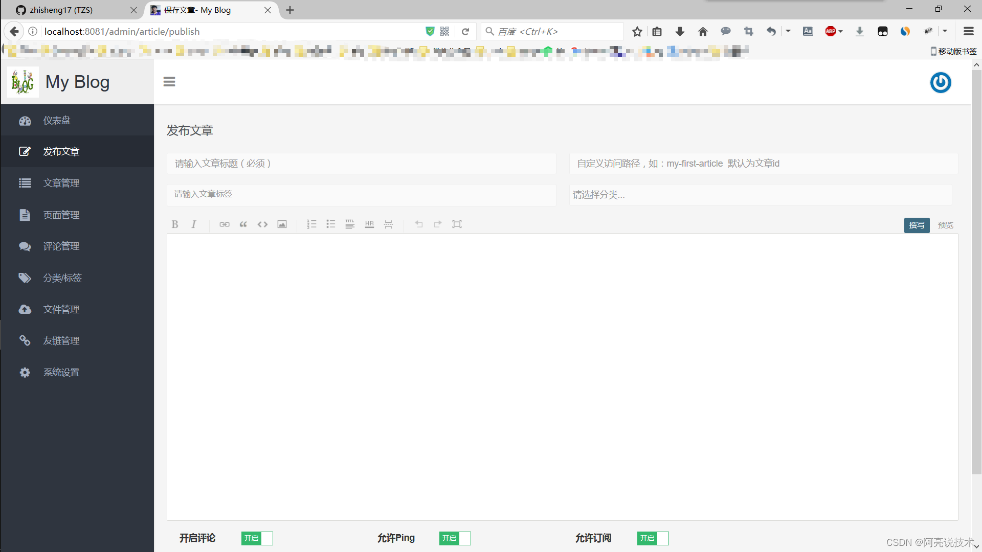 后台管理功能: 登录 个人设置 仪表盘 发布文章 文章管理 页面管理 评论管理 分类标签管理 文件管理 友情链接管理 系统设置