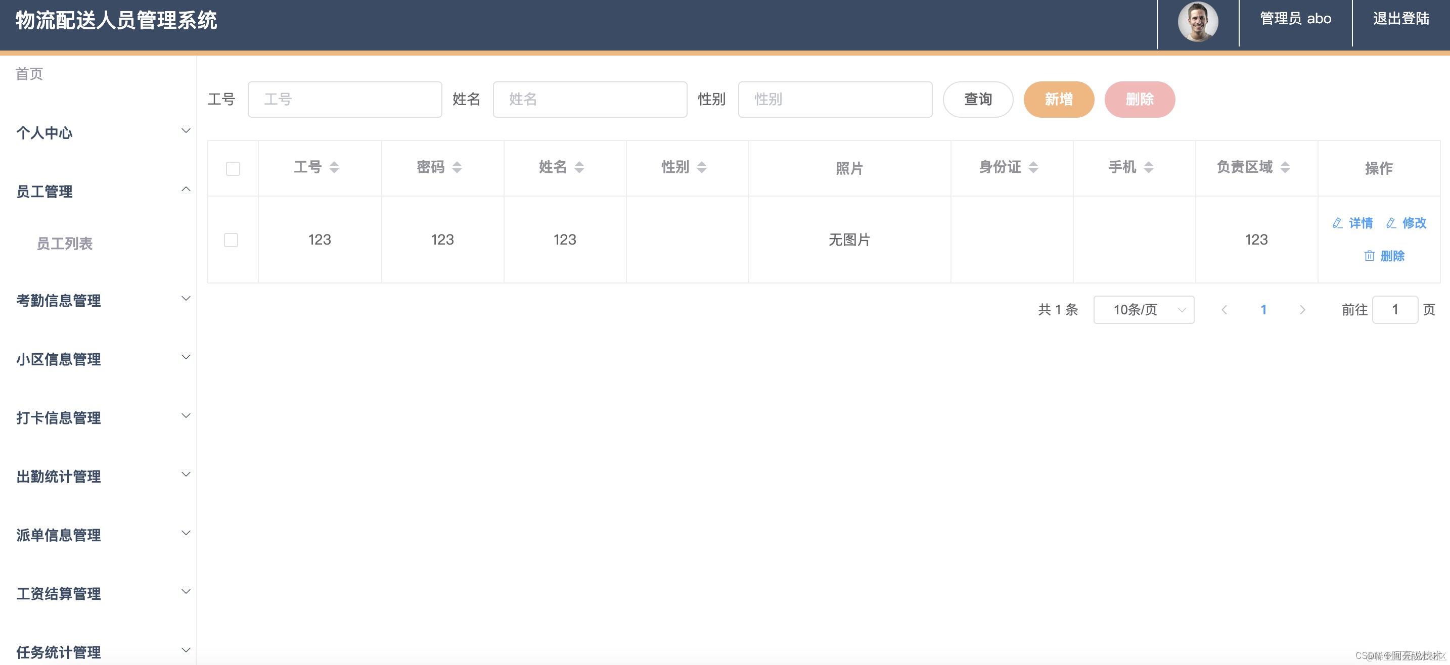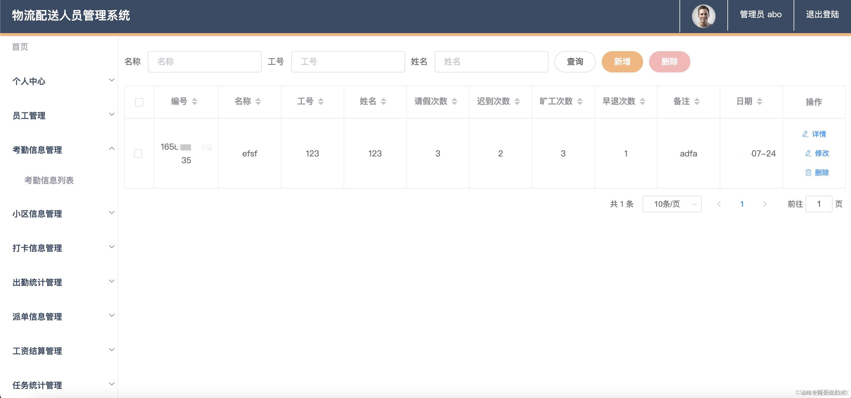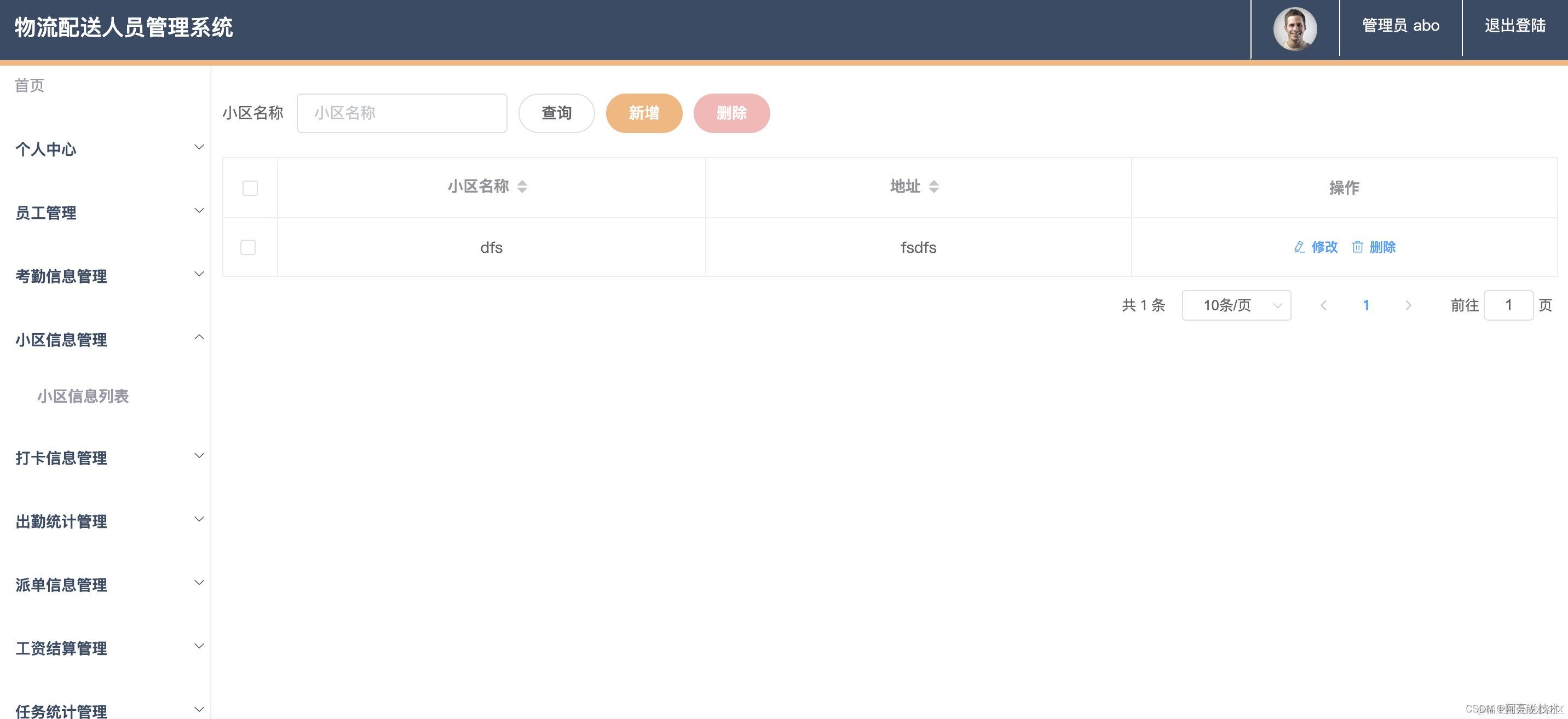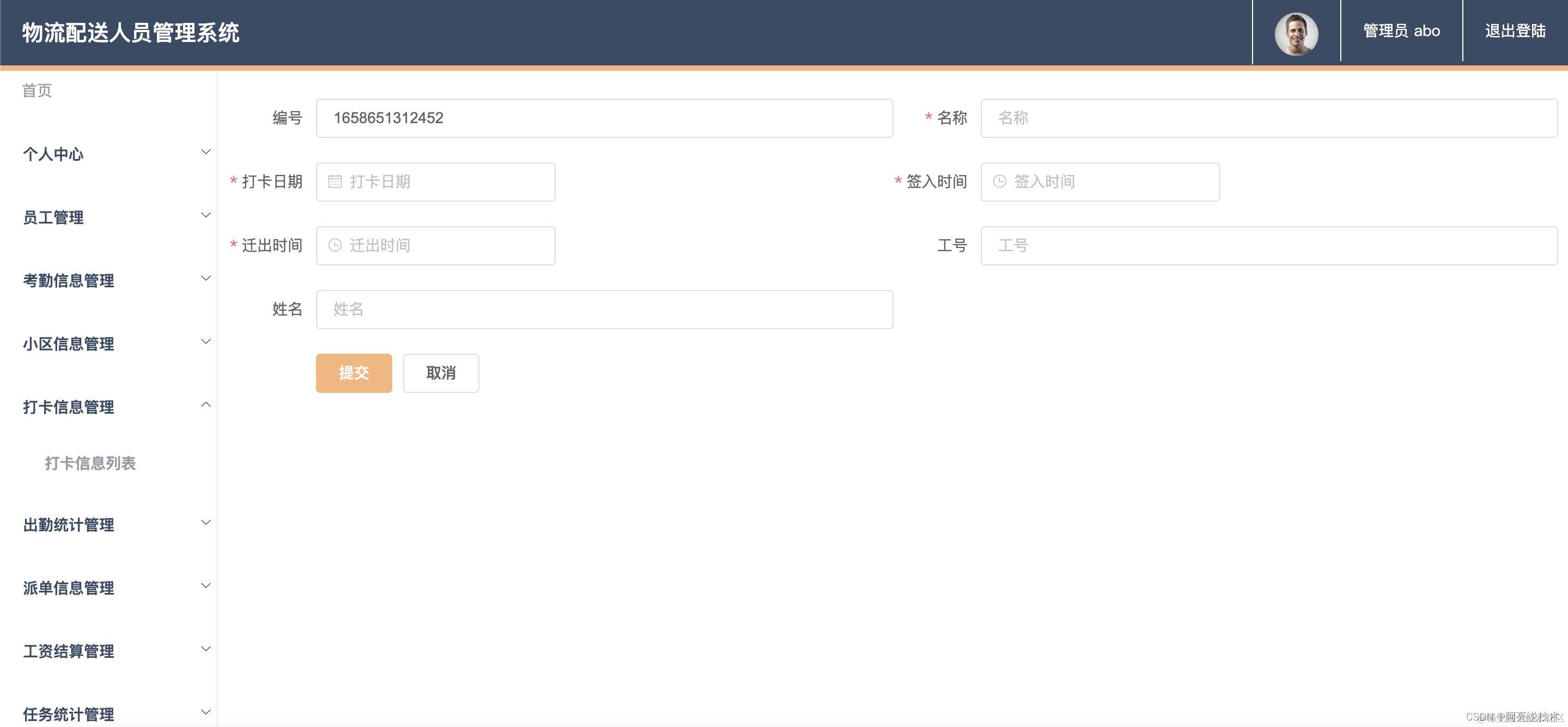 登录注册 个人中心 员工管理 考勤信息管理 小区信息管理 打卡信息管理