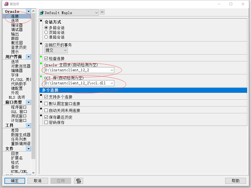 公司链接数据库,首先要有 instantclient_12_2 ,正常情况下PL/SQL Developer 可以自动检测 oracle 主目录和 OCI 库.