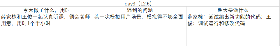 站立会议:分配明天的任务 薛家栋:尝试编出新功能的代码;王俊:调试运行和修改代码