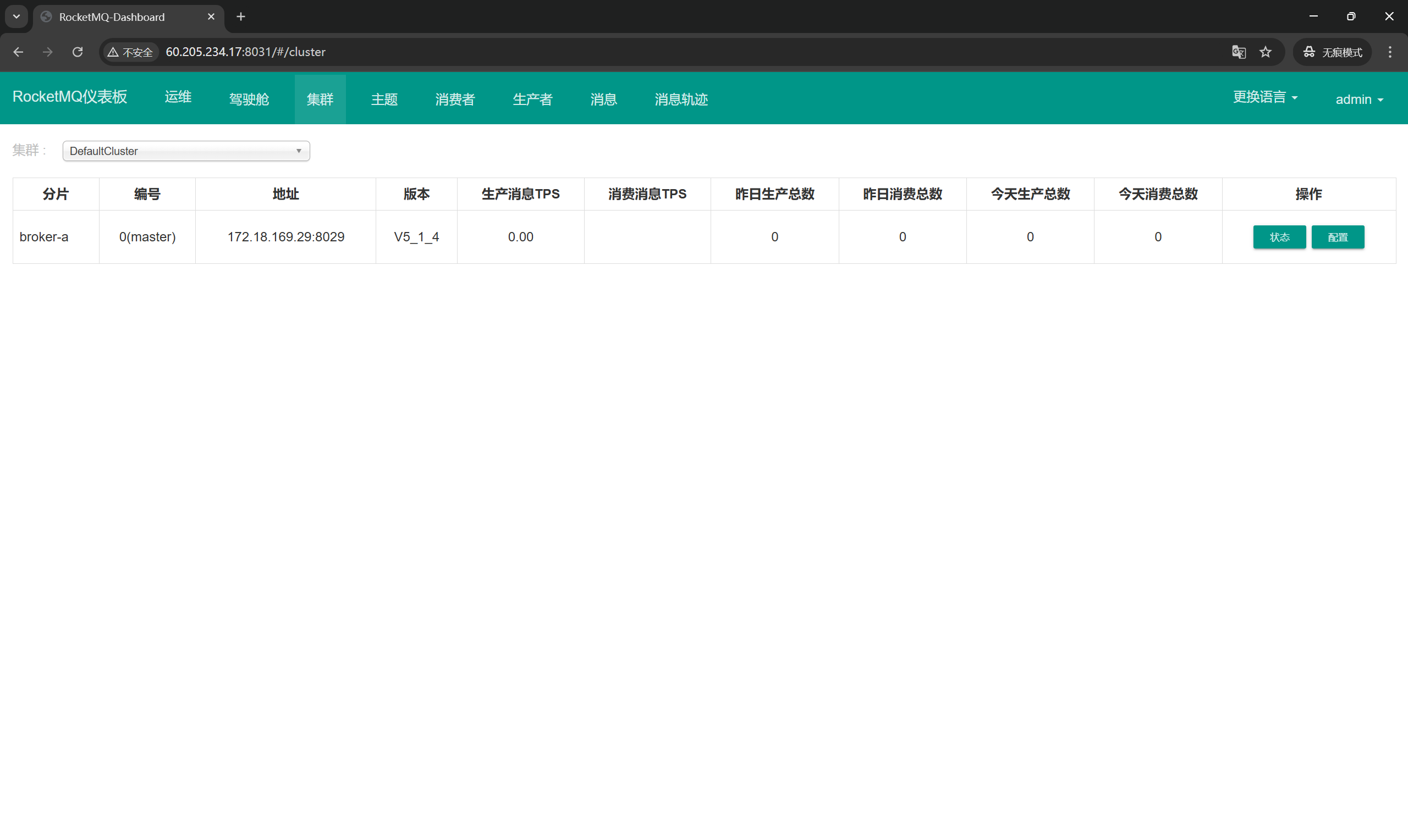 [root@app-bj-ali-ecs1 ~]# cd /usr/local/rocketmq-dashboard-1.0.0/ [root@app-bj-ali-ecs1 rocketmq-dashboard-1.0.0]# mvn clean package -Dmaven.test.skip=true [root@app-bj-ali-ecs1 rocketmq-dashboard-1.0.0]# cd /usr/local/ [root@app-bj-ali-ecs1 local]# mv rocketmq-all-5.1.4-bin-release rocketmq [root@app-bj-ali-ecs1 local]# mv rocketmq-dashboard-1.0.0/target/rocketmq-dashboard-1.0.0.jar rocketmq/ # 将编译好的dashboard jar包放进统一目录 [root@app-bj-ali-ecs1 local]# vim rocketmq/conf/application.properties # 注意这里是写在了rocketmq目录里 # # Licensed to the Apache Software Foundation (ASF) under one or more # contributor license agreements. See the NOTICE file distributed with # this work for additional information regarding copyright ownership. # The ASF licenses this file to You under the Apache License, Version 2.0 # (the "License"); you may not use this file except in compliance with # the License. You may obtain a copy of the License at # # http://www.apache.org/licenses/LICENSE-2.0 # # Unless required by applicable law or agreed to in writing, software # distributed under the License is distributed on an "AS IS" BASIS, # WITHOUT WARRANTIES OR CONDITIONS OF ANY KIND, either express or implied. # See the License for the specific language governing permissions and # limitations under the License. # server.address=0.0.0.0 server.port=8031 ### SSL setting #server.ssl.key-store=classpath:rmqcngkeystore.jks #server.ssl.key-store-password=rocketmq #server.ssl.keyStoreType=PKCS12 #server.ssl.keyAlias=rmqcngkey #spring.application.index=true spring.application.name=rocketmq-dashboard spring.http.encoding.charset=UTF-8 spring.http.encoding.enabled=true spring.http.encoding.force=true logging.level.root=INFO logging.config=classpath:logback.xml #if this value is empty,use env value rocketmq.config.namesrvAddr NAMESRV_ADDR | now, you can set it in ops page.default localhost:9876 rocketmq.config.namesrvAddr=172.18.169.29:8028 # 改成自己的namesrv ip port #if you use rocketmq version < 3.5.8, rocketmq.config.isVIPChannel should be false.default true rocketmq.config.isVIPChannel= #timeout for mqadminExt, default 5000ms rocketmq.config.timeoutMillis= #rocketmq-console's data path:dashboard/monitor # rocketmq.config.dataPath=/tmp/rocketmq-console/data #set it false if you don't want use dashboard.default true rocketmq.config.enableDashBoardCollect=true #set the message track trace topic if you don't want use the default one rocketmq.config.msgTrackTopicName= rocketmq.config.ticketKey=ticket #Must create userInfo file: ${rocketmq.config.dataPath}/users.properties if the login is required rocketmq.config.loginRequired=true rocketmq.config.dataPath=/usr/local/rocketmq/conf