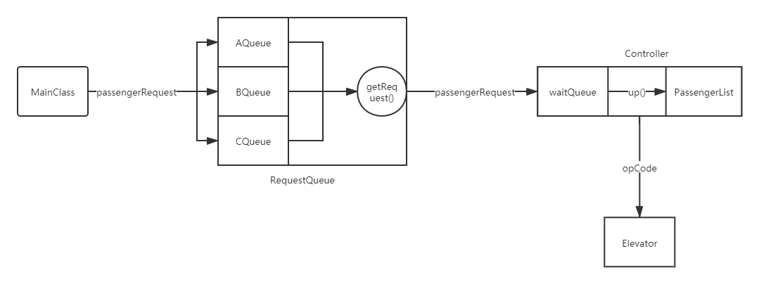 唯一的共享对象是RequestQueue。主线程将读取到的乘客请求送入RequestQueue中,RequestQueue按照一定规则将其加入到不同类型电梯的待接收请求队列中。每台电梯配有一个控制器。每次电梯向控制器询问下一步操作时,控制器就会访问RequestQueue的对应队列,并将其中请求全部取出,置于控制器内的待处理请求队列中。上述操作中只有主线程对RequestQueue的写入和电梯线程中的控制器对RequestQueue的读取操作需要使用同步块。