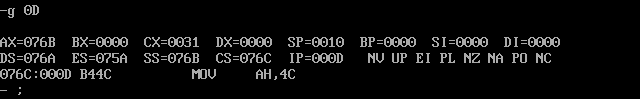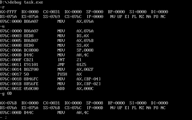 assume ds:data, cs:code, ss:stack code segment start: mov ax, data mov ds, ax mov ax, stack mov ss, ax mov sp, 20 mov ah, 4ch int 21h code ends data segment db 20 dup(0) data ends stack segment db 20 dup(0) stack ends end start