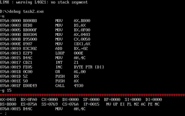 assume cs:code code segment start: mov ax, 0b800h mov ds, ax mov bx, 0f00h mov ax, 0403h mov cx, 80 s: mov [bx], ax add bx, 2 loop s mov ah, 4ch int 21h code ends end start
