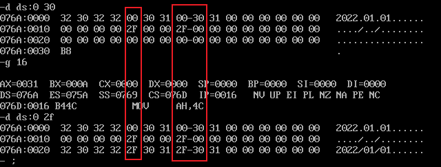 assume cs:code data1 segment db 50, 48, 50, 50, 0, 48, 49, 0, 48, 49 ; ten numbers data1 ends data2 segment db 0, 0, 0, 0, 47, 0, 0, 47, 0, 0 ; ten numbers data2 ends data3 segment db 16 dup(0) data3 ends code segment start: mov ax, data1 mov ds, ax mov bx, 0 mov cx, 10 s: mov ax, [bx] add ax, [bx+16] mov [bx+32], ax inc bx loop s mov ah, 4ch int 21h code ends end start