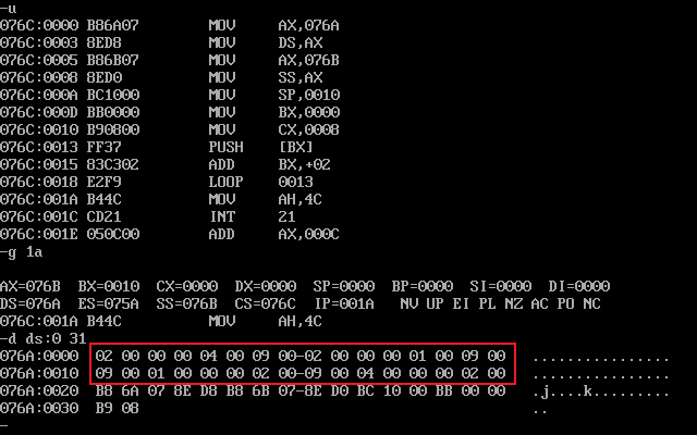 assume cs:code data1 segment dw 2, 0, 4, 9, 2, 0, 1, 9 data1 ends data2 segment dw 8 dup(0) data2 ends code segment start: mov ax, data1 mov ds, ax mov ax, data2 mov ss, ax mov sp, 16 mov bx, 0 mov cx, 8 s: push [bx] add bx, 2 loop s mov ah, 4ch int 21h code ends end start