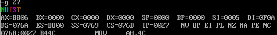 使用debug工具对程序进行调试,使用g命令一次性执行到程序返回前(即ine25执行之后、line27 执行之前)的截图