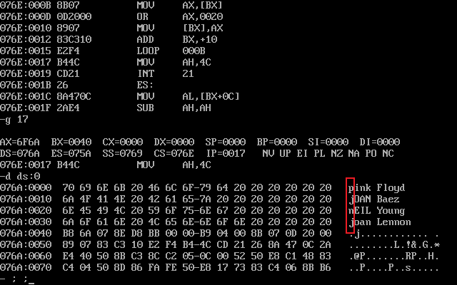 assume cs:code, ds:data data segment db 'Pink Floyd ' ; 16字节 db 'JOAN Baez ' ; 16字节 db 'NEIL Young ' ; 16字节 db 'Joan Lennon ' ; 16字节 data ends code segment start: mov ax, data mov ds, ax mov bx, 0 mov cx, 4 s: mov ax, [bx] or ax, 20h mov [bx], ax add bx, 16 loop s mov ah, 4ch int 21h code ends end start