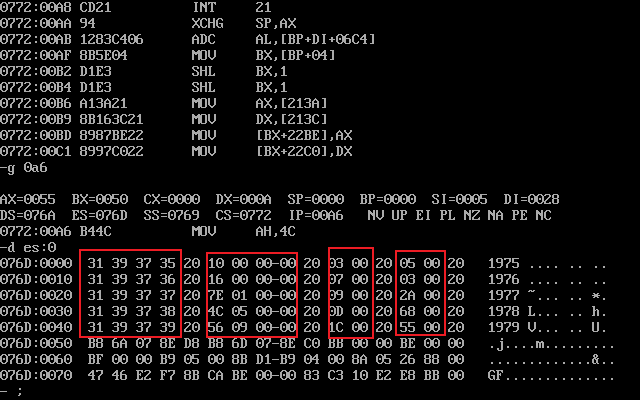 在debug中运行到程序退出之前,使用d命令查看table段对应的内存空间的截图,确认信息是 否按要求结构化地写入到指定内存