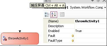 如图所示,Throw活动有两个需要设置的属性:1.FaultType,告知Throw该抛出的异常类型;2.Fault,如果该属性为空,那么仍旧抛出一个FaultType指定的类型的异常,但它是一个新的异常,没有任何信息(message属性)。如果想让他带有既定信息,就需要使用new操作符创建该异常的一个实例并把它指定到你绑定的Throw活动的相同属性上。