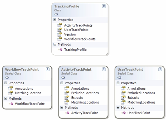 跟踪配置就是一组类型为WkflowTrack、ActivityTrackPoint或UserTrackPoint的跟踪点(tracking point)的集合。每一个跟踪点都由MatchingLocations(匹配地址)、ExcludedLocations(排除地址)、Extracts(摘记)、Annotations(注解)组成。