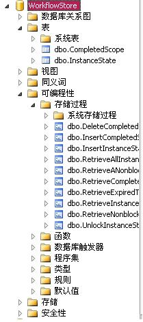 要在SQL Server数据库基础上实现工作流的持续化功能,因此需要在SQL Server数据库上创建相关数据表和存储过程,WF已经提供了相应的SQL脚本,默认情况下是路径:“C:\WINDOWS\Microsoft.NET\Framework\v3.0\Windows Workflow Foundation\SQL\ZH-CHS\”的SqlPersistenceService_Logic.sql和SqlPersistenceService_Schema.sql两个文件。创建一个数据库(名字任意,比如WorkflowStore),在该数据库上运行这两个SQL脚本。运行结束以后,就会看到两个数据表和几个存储过程被创建: