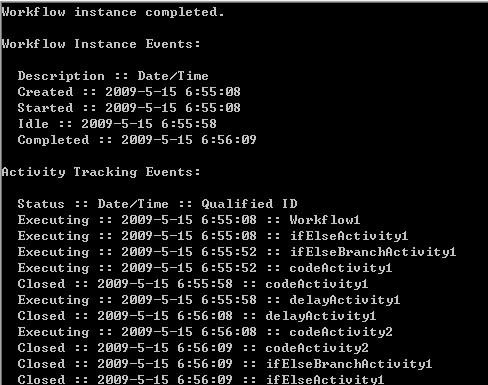 首先创建了一个SqlTrackingQuery的实例,为它提供了我们曾提供给SqlTrackingService的相同的连接字符串。然后我们通过当前工作流实例的ID(一个Guid)标识,从数据库中查询该实例的跟踪信息。该查询由SqlTrackingService.TryGetWorkflow执行。在确定数据库中有我们的信息以后,就可以通过相应的方法进行输出,比如输出实例的事件(获得活动的事件也是类似的,使用ActivityTrackingRecord