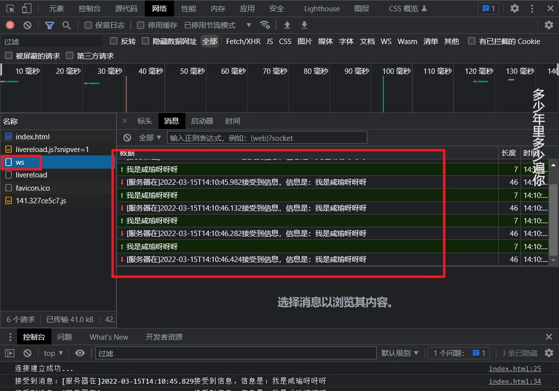 <body> <div>发送消息:</div> <input type="text" id="msgContent"/> <input type="button" value="点我发送" onclick="CHAT.chat()"/> <div>接受消息:</div> <div id="receiveMsg" style="background-color: gainsboro;"></div> <script type="application/javascript"> window.CHAT = { socket: null, init: function() { if (window.WebSocket) { CHAT.socket = new WebSocket("ws://127.0.0.1:8088/ws"); CHAT.socket.onopen = function() { console.log("连接建立成功..."); }, CHAT.socket.onclose = function() { console.log("连接关闭..."); }, CHAT.socket.onerror = function() { console.log("发生错误..."); }, CHAT.socket.onmessage = function(e) { console.log("接受到消息:" + e.data); var receiveMsg = document.getElementById("receiveMsg"); var html = receiveMsg.innerHTML; receiveMsg.innerHTML = html + "<br/>" + e.data; } } else { alert("浏览器不支持websocket协议..."); } }, chat: function() { var msg = document.getElementById("msgContent"); CHAT.socket.send(msg.value); } }; CHAT.init(); </script> </body>