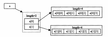 表明创建了二维数组a,a包括2个长度为4的一维数组。