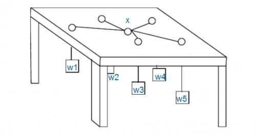 如图:有n个重物,每个重物系在一条足够长的绳子上。每条绳子自上而下穿过桌面上的洞,然后系在一起。图中X处就是公共的绳结。假设绳子是完全弹性的(不会造成能量损失),桌子足够高(因而重物不会垂到地上),且忽略所有的摩擦。