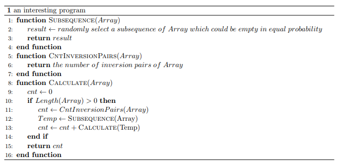 一共有 对数,每一对数为逆序数的概率均为 1/2,那么累加起来就是: