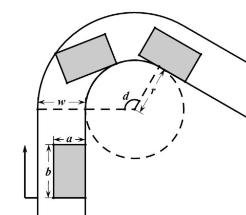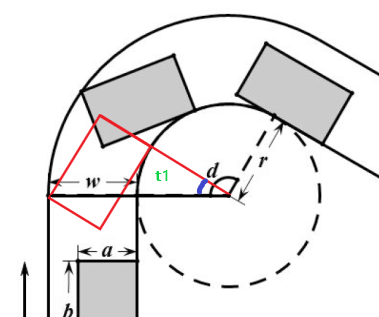 Here is what he could do. The drift car he drives is shaped like a rectangular box of width aa inches and of length bb inches. He makes a right turn of a curve whose internal boundary is an arc with dd degrees in a circle with a radius of rr inches. As a super-skilled driver, he maintains his car to keep the contact and tangency at the internal boundary. That is, the right front corner of the car should always run along the internal boundary and the direction of the car body should always be tangential to the internal boundary.