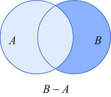 - 由属于 A 而不属于 B 的元素组成的集合,称为 B 关于 A 的相对补集,记作:A-B 或 A\B