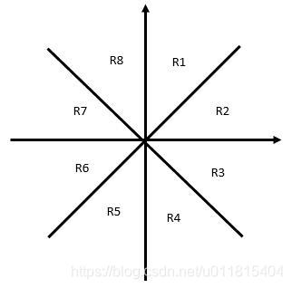 以一个每个点为原点建立直角坐标系,将其均分为八个象限