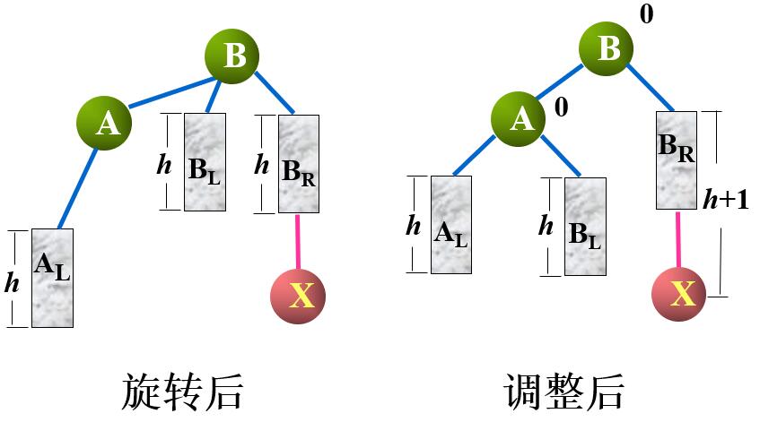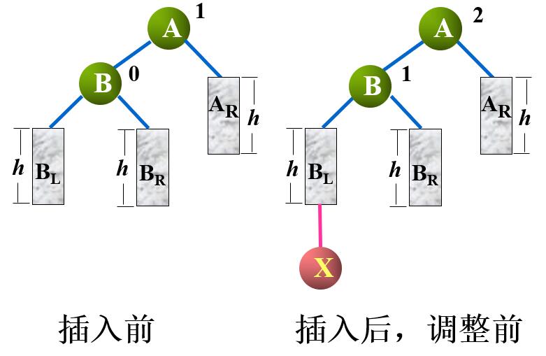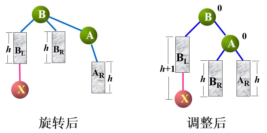 设结点 A 为最小平衡树的根结点,对该子树进行平衡调整归纳起来有以下四种情况: