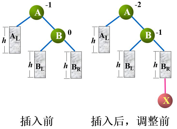 设结点 B 是结点 A 的右子树的根结点,Bl、Br 分别为结点 B 的左右子树,Al 为结点 A 的左子树,且 Bl、Br、Ar 三棵子树的深度均为 h,将结点 x 插入到结点 B 的右子树 Br 上,导致结点 A 的平衡因子由 -1 变为 -2,使得以结点 A 为根的子树失去了平衡,如下图: