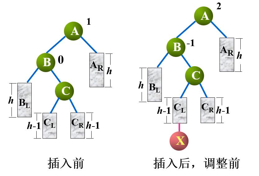 设结点 B 是结点 A 的左子树的根结点,结点 C 是结点 B 的右子树的根节点,Ar 为结点 A 的右子树,Bl 为结点 B 的左子树,Cl、Cr 分别为结点 C 的左右子树,且 Bl、Ar 两棵子树的深度为 h,Cl、Cr 两棵子树的深度为 h-1,将结点 x 插入到结点 C 的左子树 Cl 上,导致结点 A 的平衡因子由 1 变为 2,使得以结点 A 为根的子树失去了平衡,如下图: