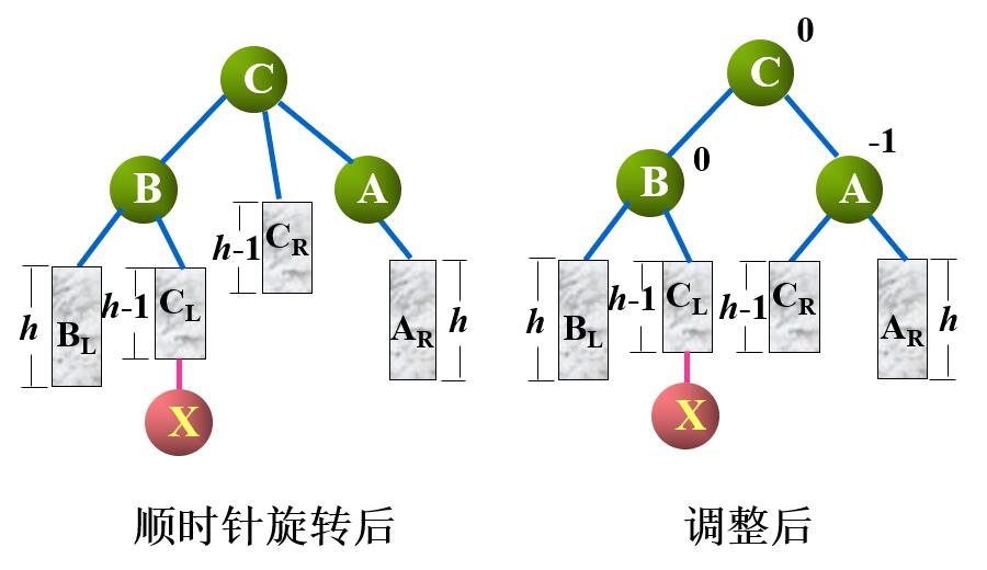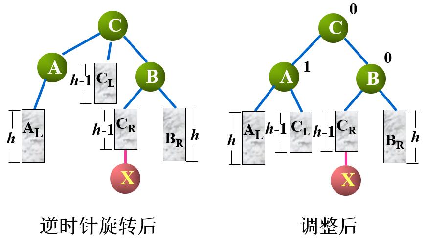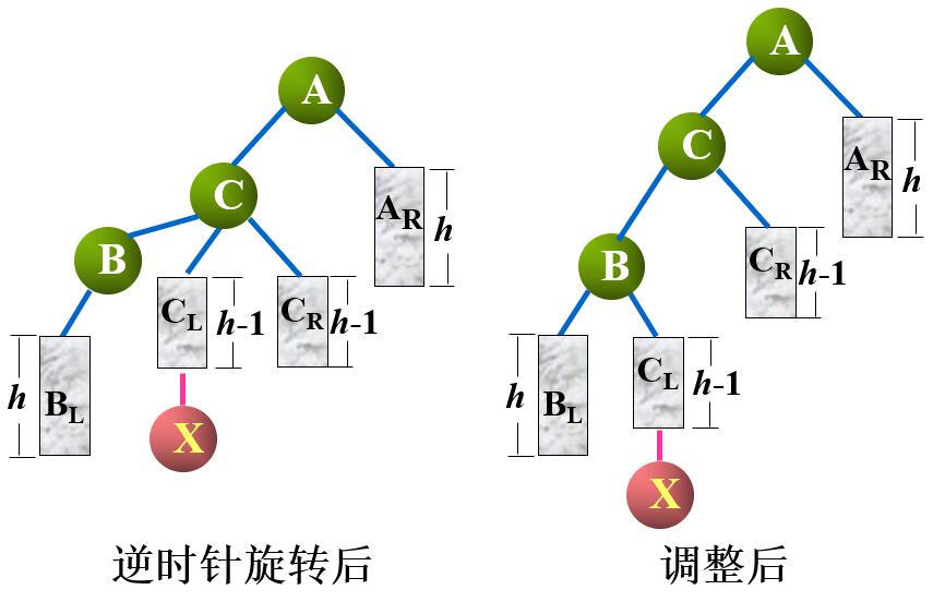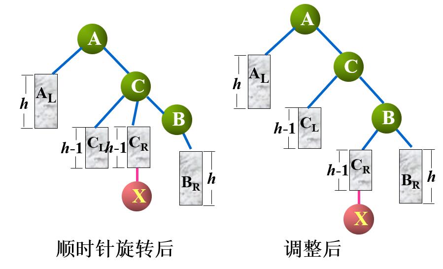 2)第二次旋转:将支撑点由结点 A 调整到结点 C, 相应的进行顺时针旋转,旋转后,结点 A 及其右子树 Ar 与结点 C 的右子树 Cr 发生冲突,按旋转优先原则,结点 C 的右子树成为结点 A 的左子树,如下图: