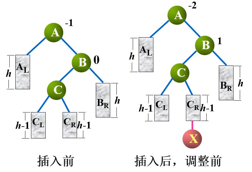 设结点 B 是结点 A 的右子树的根结点,结点 C 是结点 B 的左子树的根节点,Al 为结点 A 的左子树,Br 为结点 B 的右子树,Cl、Cr 分别为结点 C 的左右子树,且 Br、Al 两棵子树的深度为 h,Cl、Cr 两棵子树的深度为 h-1,将结点 x 插入到结点 C 的右子树 Cr 上,导致结点 A 的平衡因子由 -1 变为 -2,使得以结点 A 为根的子树失去了平衡,如下图: