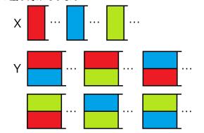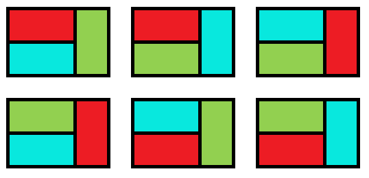 - 当左边的牌是两个横着的牌,右边的牌是两个横着的牌,此时假设左上涂颜色 1,左下涂颜色 2,那么右上只能涂颜色 2 或颜色 3,当右上涂颜色 2 时,右下要么涂颜色 1 要么涂颜色 3;当右上涂颜色 3 时,右下没有选择,只能涂颜色 1,即在原基础上乘以 2+1=3