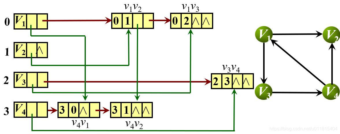 十字链表是有向图的一种存储方法,其实质上是邻接表与逆邻接表的结合,每条边对应的边结点分别组织到出边表与入边表中,其顶点表和边表结点结构如下: