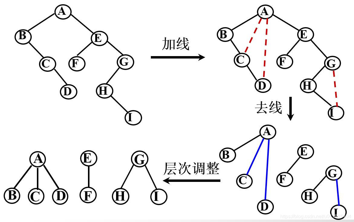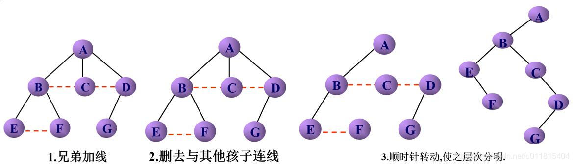 - 去线:对树中的每个结点,只保留他与第一个子结点的连线,删除与其他子结点的连线