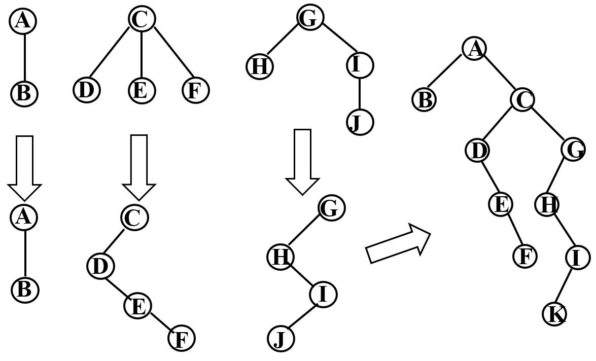 显然,这一转换过程是可逆的,即根据二叉树的根结点有无右子树,将其还原成树或森林。