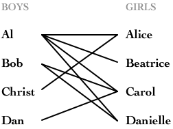 举例来说,如下图所示,若存在某一对男孩和女孩之间存在相连的边,就意味着他们彼此喜欢。是否可能让所有男孩和女孩两两配对,使得每对儿都互相喜欢?这就是完全匹配问题。而最多有多少互相喜欢的男孩/女孩可以配对?这就是最大匹配问题。