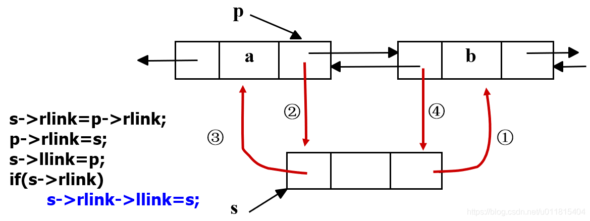 s->rlink->llink=s;//新结点s的右指针的左指针指向新结点s