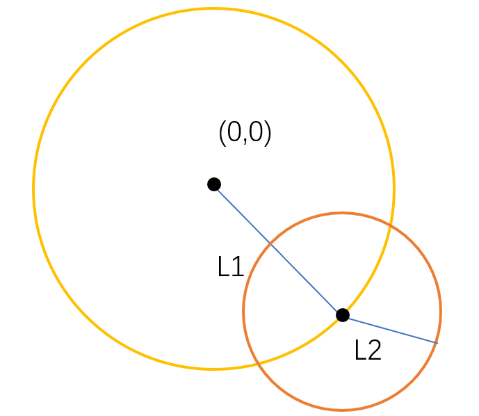 若只看 l1,可以发现其另一端点的路径是一个圆弧,当在这个圆弧上任一点放 l2 时,可以发现可达的位置是一个圆环,因此,根据两个圆环的关系进行模拟,即可找出离目标点最近的点