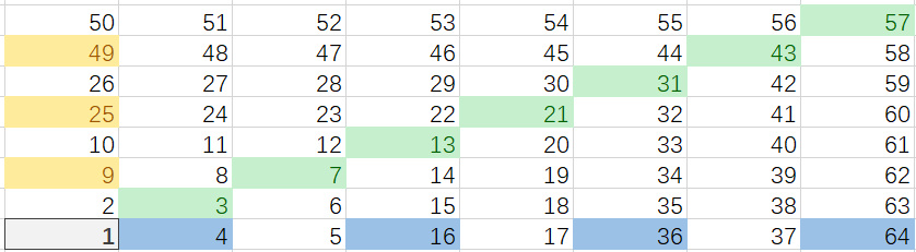 从表中可以看出,蓝色的是偶数的平方,黄色的是奇数的平方,绿色是对角线,满足 x(x-1)+1,x 为行数