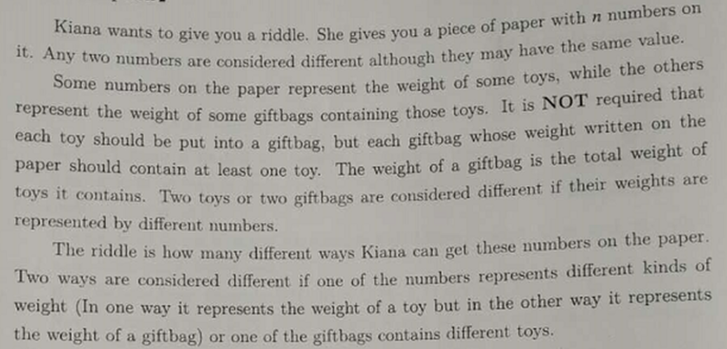 但袋子中玩具的个数无法确定,因此无法用简单的 1、0 来表示是玩具还是袋子,但由于袋子的重量是由袋子中玩具的重量相加得来,因此可用 1 来表示考虑当前数字,0 表示不考虑当前数字,通过对数字的考虑来进行组合,从而判断袋子的重量是否合理,例如:101 表示考虑第 1、3 数字时的合法方案数,即第 1、3 个数字可以组成一个袋子,用 f[101] 即可表示组成袋子的方案数,再用 dp[i] 来表示合法方案数。