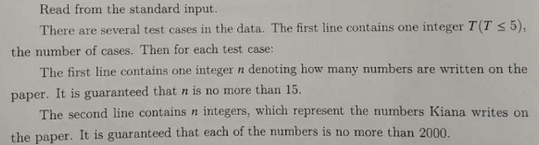题意:有 t 组数据,对于每组数据,给出 n 个数字,最多有 n 个玩具,其中每个数字有两种含义,要么是一个玩具的重量,要么是一个袋的重量,袋子的重量表示袋子中的玩具的重量,其重量为任意个玩具的重量之和,问最多有多少种方案
