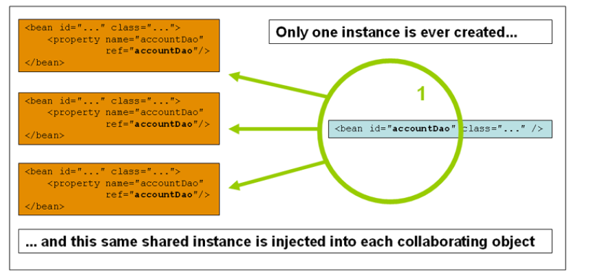 在每个Spring IoC容器中一个bean定义只有一个对象实例(共享)。
