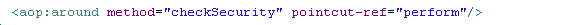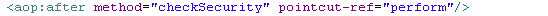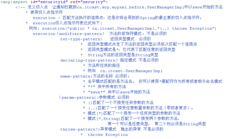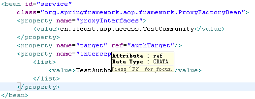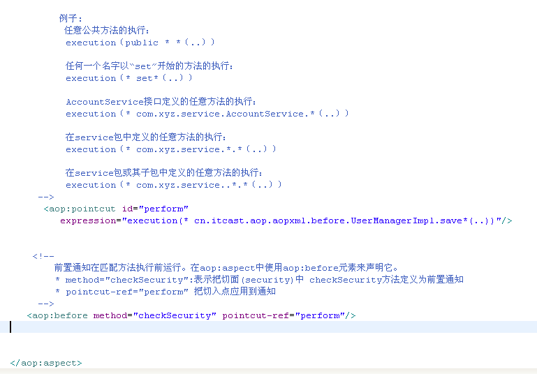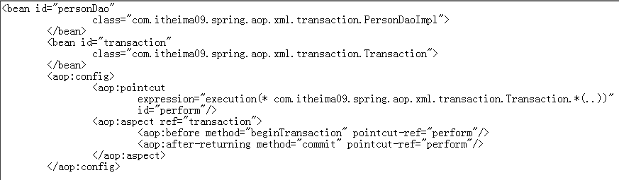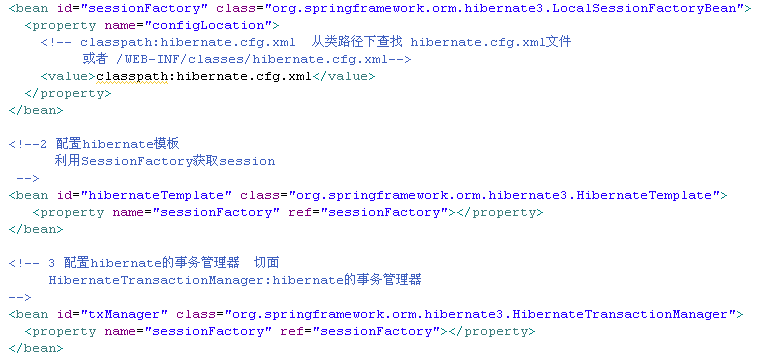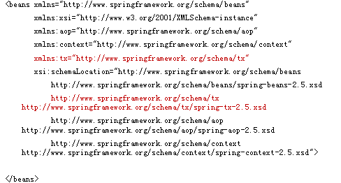 1 <?xml version="1.0" encoding="UTF-8"?> 2 <beans xmlns="http://www.springframework.org/schema/beans" 3 xmlns:aop="http://www.springframework.org/schema/aop" xmlns:tx="http://www.springframework.org/schema/tx" 4 xmlns:xsi="http://www.w3.org/2001/XMLSchema-instance" 5 xsi:schemaLocation="http://www.springframework.org/schema/beans 6 http://www.springframework.org/schema/beans/spring-beans-2.5.xsd 7 http://www.springframework.org/schema/aop 8 http://www.springframework.org/schema/aop/spring-aop-2.5.xsd 9 http://www.springframework.org/schema/tx 10 http://www.springframework.org/schema/tx/spring-tx-2.5.xsd"> 11 <bean id="sessionFactory" 12 class="org.springframework.orm.hibernate3.LocalSessionFactoryBean"> 13 <property name="configLocation"> 14 <value>classpath:hibernate/hibernate.cfg.xml</value> 15 </property> 16 </bean> 17 <!-- 18 事务管理器 19 --> 20 <bean id="transactionManager" class="org.springframework.orm.hibernate3.HibernateTransactionManager"> 21 <property name="sessionFactory"> 22 <ref bean="sessionFactory"/> 23 </property> 24 </bean> 25 <tx:advice id="tx" transaction-manager="transactionManager"> 26 <tx:attributes> 27 <tx:method name="save*" 28 read-only="false"/> 29 </tx:attributes> 30 </tx:advice> 31 <aop:config> 32 <aop:pointcut 33 expression="execution(* com.itheima09.s2sh.service.impl.*.*(..))" 34 id="perform"/> 35 <aop:advisor advice-ref="tx" pointcut-ref="perform"/> 36 </aop:config> 37 </beans>