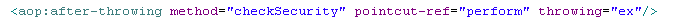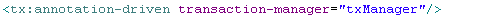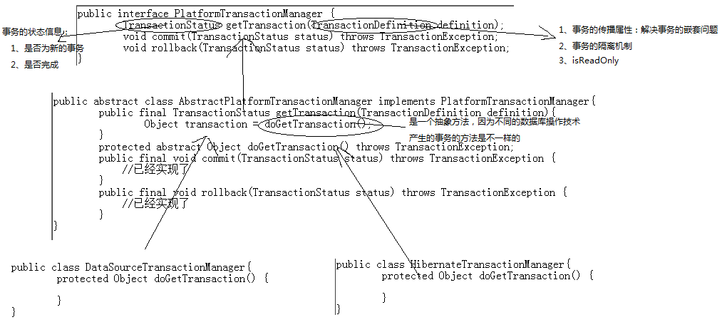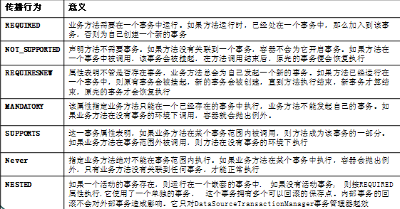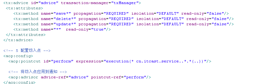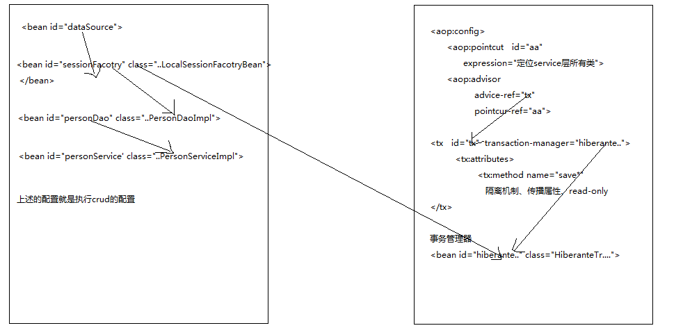 1 <bean id="transactionManager" class="org.springframework.orm.hibernate3.HibernateTransactionManager"> 2 <property name="sessionFactory"><ref local="sessionFactory"/></property> 3 </bean> 4 <bean id="baseTransactionProxy" abstract="true" class="org.springframework.transaction.interceptor.TransactionProxyFactoryBean"> 5 <property name="transactionManager"> 6 <ref bean="transactionManager" /> 7 </property> 8 <property name="transactionAttributes"> 9 <props> 10 <prop key="save*">PROPAGATION_REQUIRED</prop> 11 <prop key="update*">PROPAGATION_REQUIRED</prop> 12 <prop key="find*">PROPAGATION_REQUIRED</prop> 13 <prop key="*">PROPAGATION_REQUIRED,readOnly</prop> 14 </props> 15 </property> 16 </bean>