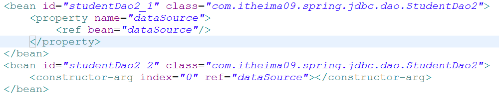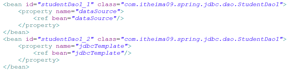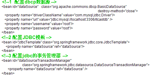 1 <?xml version="1.0" encoding="UTF-8"?> 2 <beans xmlns="http://www.springframework.org/schema/beans" 3 xmlns:aop="http://www.springframework.org/schema/aop" xmlns:tx="http://www.springframework.org/schema/tx" 4 xmlns:xsi="http://www.w3.org/2001/XMLSchema-instance" 5 xsi:schemaLocation="http://www.springframework.org/schema/beans 6 http://www.springframework.org/schema/beans/spring-beans-2.5.xsd 7 http://www.springframework.org/schema/aop 8 http://www.springframework.org/schema/aop/spring-aop-2.5.xsd 9 http://www.springframework.org/schema/tx 10 http://www.springframework.org/schema/tx/spring-tx-2.5.xsd"> 11 <!-- 引入dataSource 把dao层和service层的类导入进来 --> 12 <bean 13 class="org.springframework.beans.factory.config.PropertyPlaceholderConfigurer"> 14 <property name="locations"> 15 <value>classpath:jdbc.properties</value> 16 </property> 17 </bean> 18 <bean id="dataSource" destroy-method="close" 19 class="org.apache.commons.dbcp.BasicDataSource"> 20 <property name="driverClassName" value="${jdbc.driverClassName}" /> 21 <property name="url" value="${jdbc.url}" /> 22 <property name="username" value="${jdbc.username}" /> 23 <property name="password" value="${jdbc.password}" /> 24 </bean> 25 26 <bean id="sessionFactory" 27 class="org.springframework.orm.hibernate3.LocalSessionFactoryBean"> 28 <property name="dataSource"> 29 <ref bean="dataSource" /> 30 </property> 31 <!-- 导入映射文件所在的路径 --> 32 <property name="mappingDirectoryLocations"> 33 <list> 34 <value>classpath:com/itheima09/spring/hibernate/transaction/domain 35 </value> 36 </list> 37 </property> 38 <!-- 其他配置 --> 39 <property name="hibernateProperties"> 40 <props> 41 <prop key="hibernate.dialect">org.hibernate.dialect.MySQL5Dialect</prop> 42 <prop key="hbm2ddl.auto">update</prop> 43 </props> 44 </property> 45 </bean> 46 <bean id="sessionFactory2" 47 class="org.springframework.orm.hibernate3.LocalSessionFactoryBean"> 48 <property name="configLocation"> 49 <value>classpath:hibernate.cfg.xml</value> 50 </property> 51 </bean> 52 53 <bean id="personDaoCallback" class="com.itheima09.spring.hibernate.callback.PersonDaoCallback"> 54 <property name="sessionFactory"> 55 <ref bean="sessionFactory2"/> 56 </property> 57 </bean> 58 </beans>