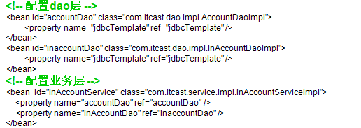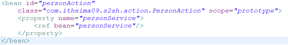 1 <?xml version="1.0" encoding="UTF-8"?> 2 <beans xmlns="http://www.springframework.org/schema/beans" 3 xmlns:aop="http://www.springframework.org/schema/aop" xmlns:tx="http://www.springframework.org/schema/tx" 4 xmlns:xsi="http://www.w3.org/2001/XMLSchema-instance" 5 xsi:schemaLocation="http://www.springframework.org/schema/beans 6 http://www.springframework.org/schema/beans/spring-beans-2.5.xsd 7 http://www.springframework.org/schema/aop 8 http://www.springframework.org/schema/aop/spring-aop-2.5.xsd 9 http://www.springframework.org/schema/tx 10 http://www.springframework.org/schema/tx/spring-tx-2.5.xsd"> 11 <bean id="personDao" class="com.itheima09.s2sh.dao.impl.PersonDaoImpl"> 12 <property name="sessionFactory"> 13 <ref bean="sessionFactory"/> 14 </property> 15 </bean> 16 <bean id="personService" class="com.itheima09.s2sh.service.impl.PersonServiceImpl"> 17 <property name="personDao"> 18 <ref bean="personDao"/> 19 </property> 20 </bean> 21 <bean id="personAction" 22 class="com.itheima09.s2sh.action.PersonAction" scope="prototype"> 23 <property name="personService"> 24 <ref bean="personService"/> 25 </property> 26 </bean> 27 </beans>