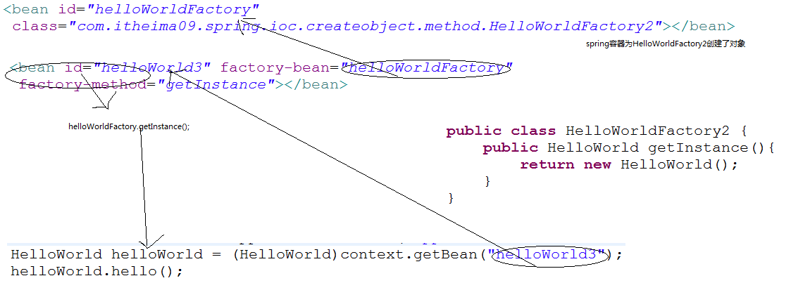 给工厂类创建了一个对象helloWorldFactory,再利用工厂对象调用工厂方法。