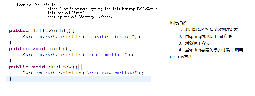 当foo被载入到Spring容器中时调用init-method方法。当foo从容器中删除时调用destory-method(scope = singleton有效)